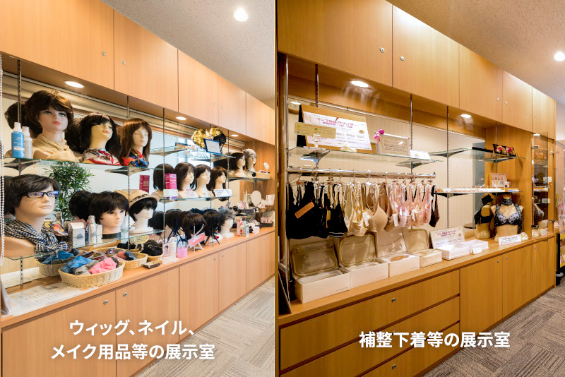 「患者・家族総合支援センター暖だん」では、ウィッグやケア帽子、ブレストケア製品(補整下着や人工乳房等)、メイク用品等、アピアランスケア関連の各種物品の展示や試着、相談対応を行っています。また医療者によるアピアランスケアセミナーを開催(不定期)しています。